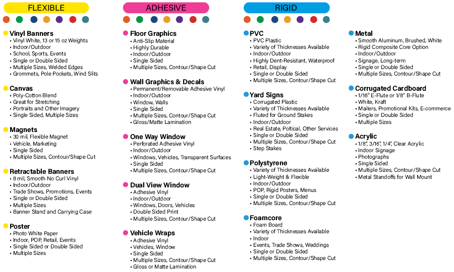 Adhesive-backed, Backlit, Clings, Coro, Fabrics, Film and Transparency, Foam Core, Labels, Magnets, Metal, Premium Paper, Sintra, Vinyl, Wood